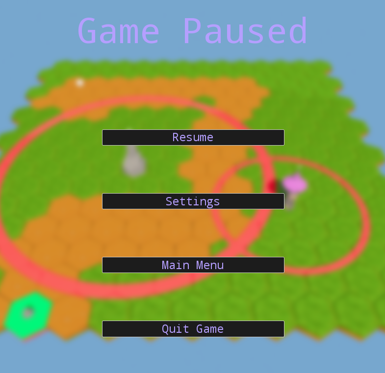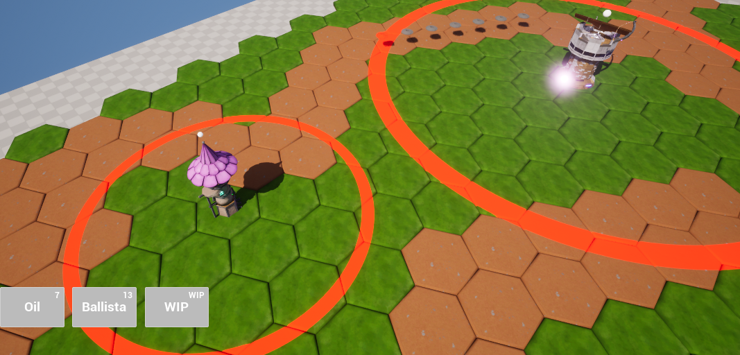 The section that has taken us the longest time! We've developed four maps, each with a grid made of hexagons. A UFO can be seen, coming in and creating a path toward the home base using a laser. From there, the enemies can traverse the paths, and the players can place towers around them. The future for the maps is mostly visual, getting fun map pieces implemented as well as details such as a portal for the aliens to come out of. On top of that, we plan to have our mechanic of the aliens creating secondary paths come in soon.